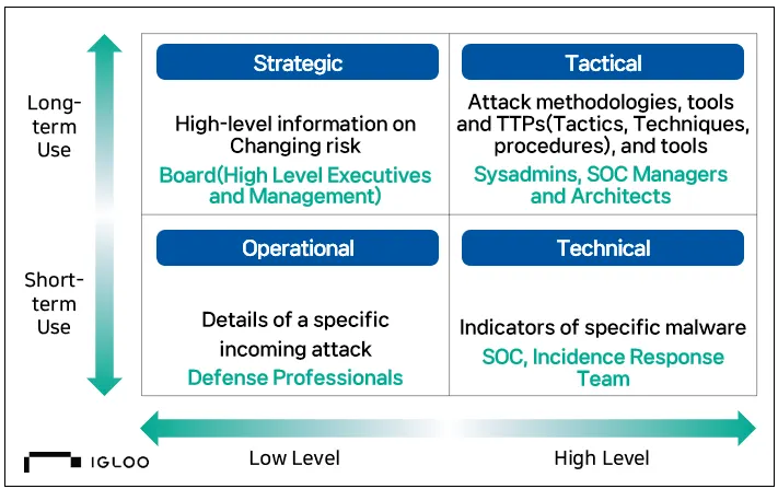 고도화된 SOC를 위해 Threat Intelligence를 적용 함에 있어서 [대응기술 그림 1-3]과 [대응기술 그림 1-4]를 고려해야 한다. [대응기술 그림 1-3]은 정보의 특성과 범위에 따른 Threat Intelligence의 분류 유형을 정리한 것으로 즉각적인 위협에 대해서는 전술적(Tactical)이거나 기술적 (Technical)이 범주를 나타내고, 더 광범위한 추세 분석을 위해서는 운영적(Operational)이거나 전략적(Strategic)인 범주로 접근할 수 있다.