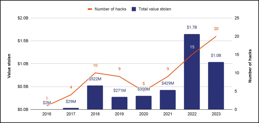 2024년 유엔 전문가 패널 보고서(Final report of the Panel of Experts submitted pursuant to resolution 2680, S/2024/215)에 따르면 2017년부터 2023년 사이에 Kimsuky, Lazarus Group, Andariel, BlueNoroff를 포함한 정찰총국(RGB)에 종속된 사이버 위협 주체에 의해 탈취된 암호화폐는 약 30억 달러에 달하며 이는 해킹으로 인해 탈취된 전체 암호화폐 수치의 44%에 달한다. 이에 강력한 법 진행과 규제를 기반으로 암호화폐 생태계를 보호하기 위해 노력하고 있으나 [보안 위협 그림 1-2]과같이 북한의 암호화폐 탈취를 위한 공격은 지속되고 있다.