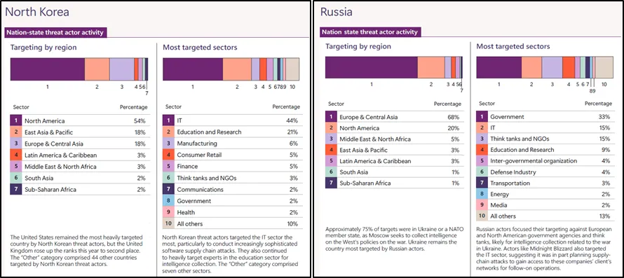 Microsoft의 ‘Microsoft Digital Defense Report 2024’에 따르면 [보안 위협 그림 1-3]과같이 중국, 이란, 러시아, 북한의 국가 지원 위협 행위자들의 공격 양상을 분석한 결과 북한은 공격의 상당수가 IT와 교육 및 리서치 영역에 포진되어 있으며, 북아메리카의 미국과 동아시아를 주로 공격하는 것으로 나타났다. IT 영역을 공격할 때 주로 사용하는 공격 방법은 소프트웨어 기반의 공급망 공격(software supply chain attack)을 사용하였으며, 스피어피싱과 같이 타깃팅된 공격 방법을 이용하여 정보 수집의 목적의 공격을 수행한 것으로 나타났다.