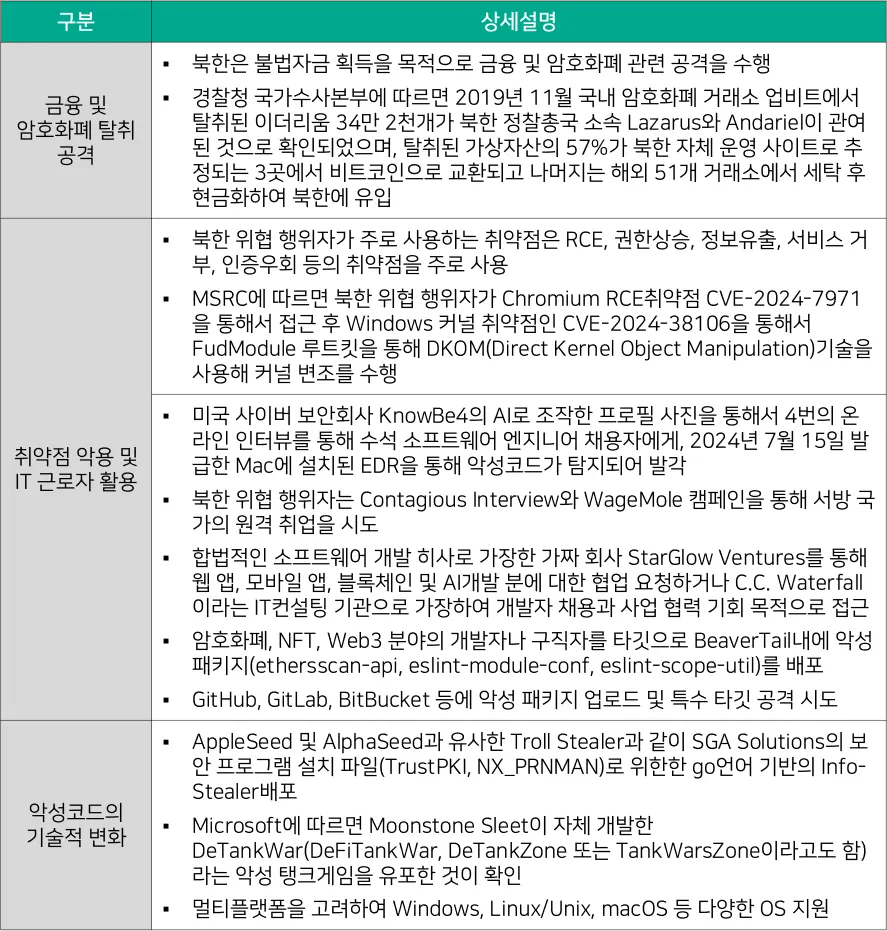 [보안위협 표 1-1]은 2024년 북한 위협 행위자에 의한 공격 벡터를 분석한 결과다. 최근 몇년간 북한 위협 행위자는 △ 금융 및 암호화폐 탈취 공격, △ 취약점 악용 및 IT 근로자 활용, △ 악성코드의 기술적 변화 양상을 보이고 있다.