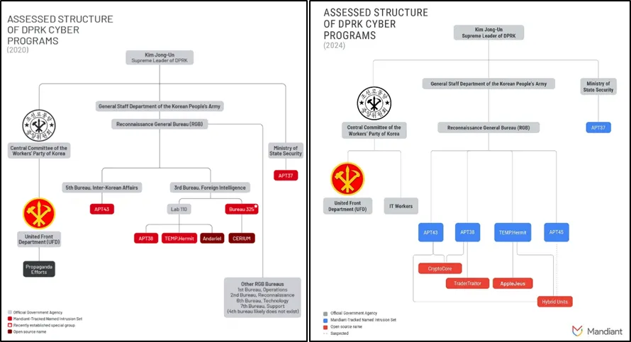 Mandiant의 ‘APT45: North Korea’s Digital Military Machine’에 따르면 북한 위협 행위자 중 간첩 활동을 주로 수행한 APT45의 공격이 재정적 목적을 달성하기 위해 정부 기관 및 방위 산업에 대한 공격을 수행하는 한편 금융 분야를 표적으로 삼는 공격을 동시에 수행하고 있다고 밝혔다. [보안 위협 그림 1-1]과같이 APR45는 Andariel, Onyx Sleet, Stonefly, Silent Chollima로 활동하고 있으며, 이와 같은 활동은 Lazarus와도 연관성이 있다.