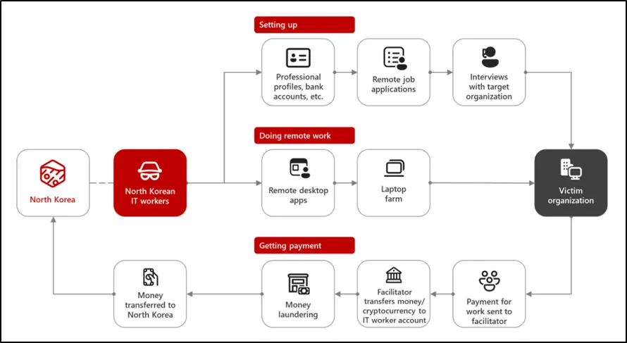 [보안위협 그림 1-4] 북한 IT 근로자 생태계 (출처 : Microsoft)