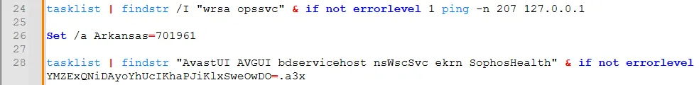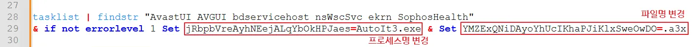○ 난독화 해제 후 분석한 결과, tasklist와 findstr 명령어를 사용하여 보안 관련 프로세스들이 존재하는지 확인하는 코드 발견