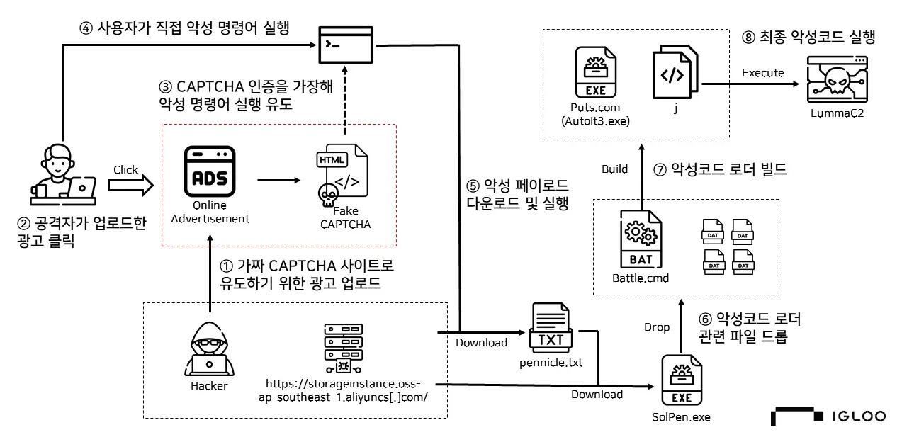 ○ 온라인 광고를 통해 사용자를 가짜 CAPTCHA* 페이지로 유도하여 악성코드를 배포하는 fakeCAPTCHA 멀버타이징 캠페인 관련 악성 파일을 확보하여 분석