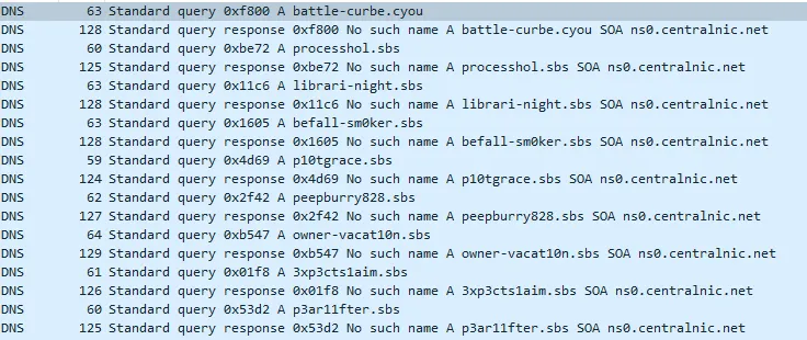 ○ 로그에서 여러 C2 도메인으로 DNS 검색을 시도하는 것이 확인되었으나 현재는 모든 C2가 접근이 불가능한 상태