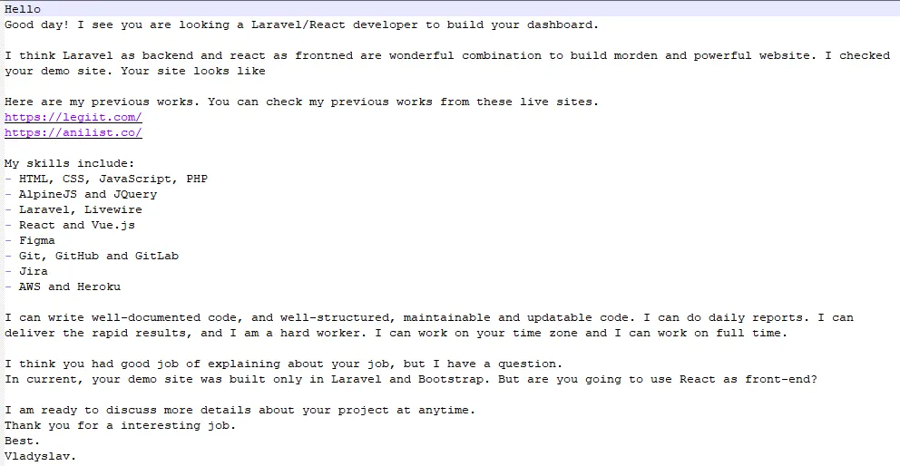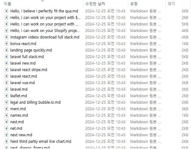 ○ 구직자가 본인의 기술과 결과물을 홍보해 일자리를 구한다고 클라이언트에게 제안하는 멘트가 저장된 파일 약 100개가 확인됩니다.
