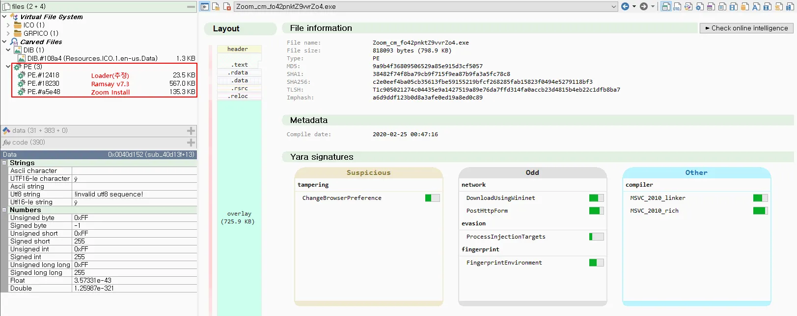 ○ 악성파일 내부에는 정상 Zoom 설치 파일과 UPX로 패킹된 Loader 추정 악성파일 및 Ramsay 악성코드가 발견됩니다.