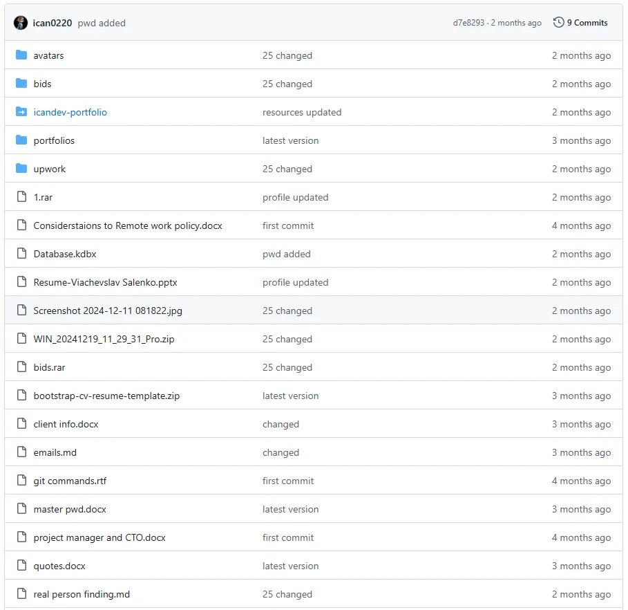○ “5. 위장 취업을 목적으로 하는 Github 계정” 분석 시 확인된 내용들 중 특이사항이 많은 CryptoNinja0331 계정의 데이터를 중점으로 분석하면서, ican0220 계정의 데이터 중 일부 데이터를 추가로 분석 진행했습니다.