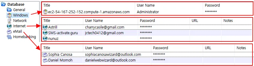 ○ 오픈 소스 소프트웨어로 배포되는 암호 관리 유틸리티 KeePass로 관리되는, 각종 계정 정보가 저장된 데이터베이스 파일 발견되었습니다. Database 정보 확인 시 필요한 마스터 패스워드는 별도 문서에 작성된 상태입니다.