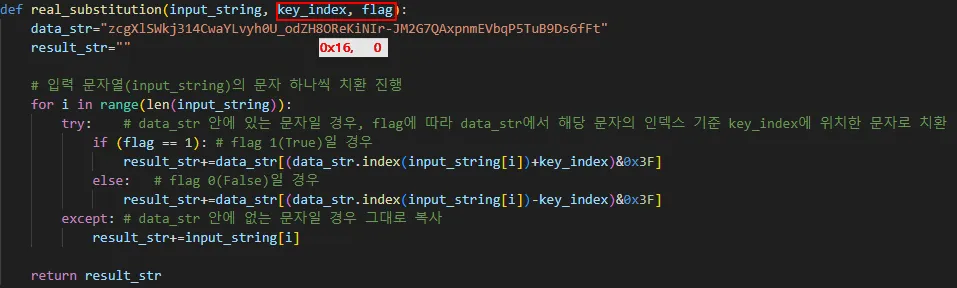이번 파일의 경우 문자열 복호화 시 key_index는 0x16, flag는 0으로 고정하여 사용