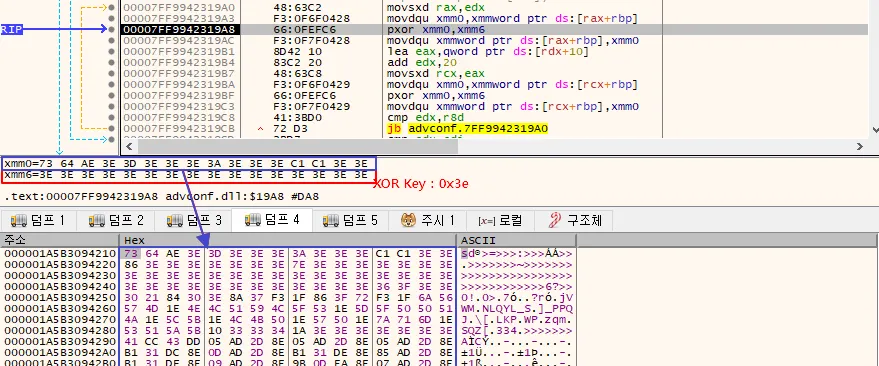 ○ 실행 시 파일 내 숨겨진 페이로드를 XOR Key(0x3E)를 이용해 복호화하고 메모리 할당 후 복사해서 접근