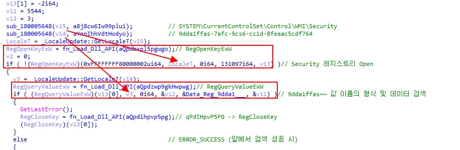 레지스트리 등록 과정이 발견되지 않으며, 레지스트리 미 발견 시 종료하는 특징이 확인되어 사전 공격에서 레지스트리를 등록하는 과정이 있을 것으로 추정