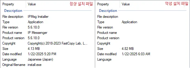 [그림 3] 정상 및 악성 설치 파일 정보 비교