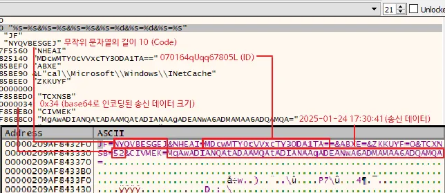 ○ 통신은 무작위 문자열 길이로 표현되어 전달되는 [표 4]의 Code 정보를 통해 데이터 교환이 이루어지며, 네트워크상에서 악성 행위를 숨기기 위해 base64 인코딩과 무작위 문자열을 사용해 데이터를 난독화