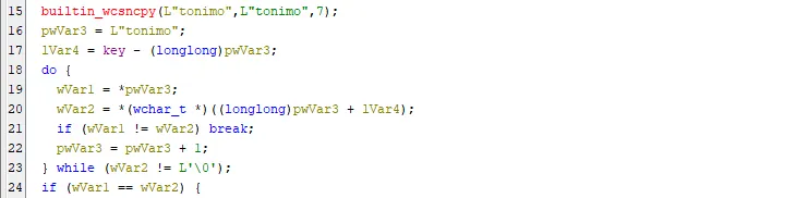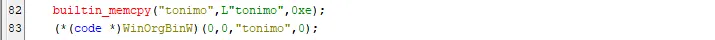 ○ 호출된 WinOrgBinW 함수는 샌드박스 혹은 자동화 도구 등에서 DLL 단독으로 실행되는 것을 막기 위해 전달된 파라미터가 "tonimo" 문자열과 일치하는지 확인하는 안티리버싱 코드가 존재