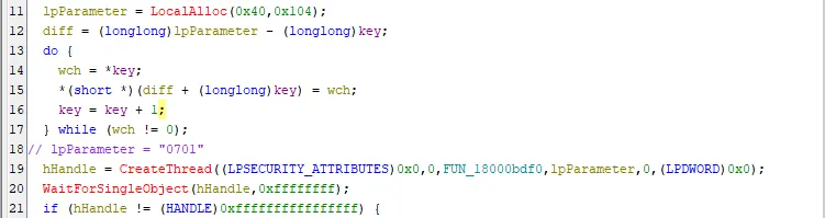 ○ 호출된 GetWindowSizedW 함수는 “0701” 문자열을 생성할 스레드에 전달해 앞선 파일들과 달리 전달된 문자열 길이를 체크하는 안티리버싱 수행