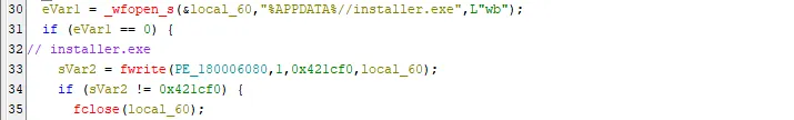 ○ 안티리버싱을 통과했다면 %APPDATA% 폴더에 정상 설치 파일과 동일한 해시 값을 가지는 installer.exe 파일을 생성