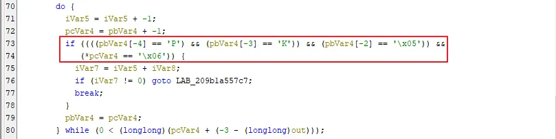 ○ 다운로드 파일에서 ZIP 파일의 시그니처 문자열 “PK” 검색을 수행하는 것으로 보아 해당 파일은 압축 파일로 사료되며, 압축 해제 후 파일리스 방식으로 메모리에 로드 후 Export 함수를 실행하고 그 결과를 Code 12 패킷을 사용해 전송하는 것으로 분석