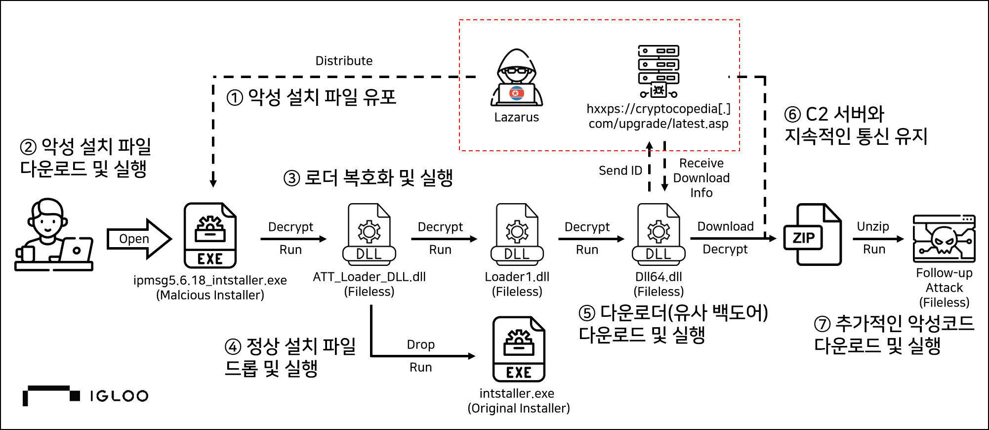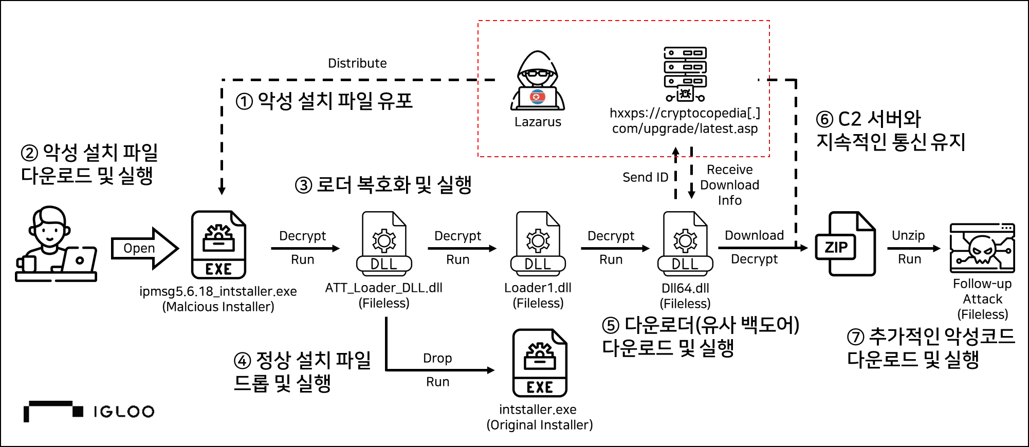 ○ 북한 해킹 그룹 Lazarus가 사용한 IP Messenger(IPMsg)* 설치 파일로 위장한 악성코드 확보 후 분석