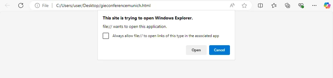 ○ HTML 파일은 WebDEV* 공유 파일을 탐색창을 통해 확인하는 코드가 작성되어 있어 파일을 오픈하게 되면 탐색창으로 공유 파일을 확인할 것인지 묻는 알림이 발생