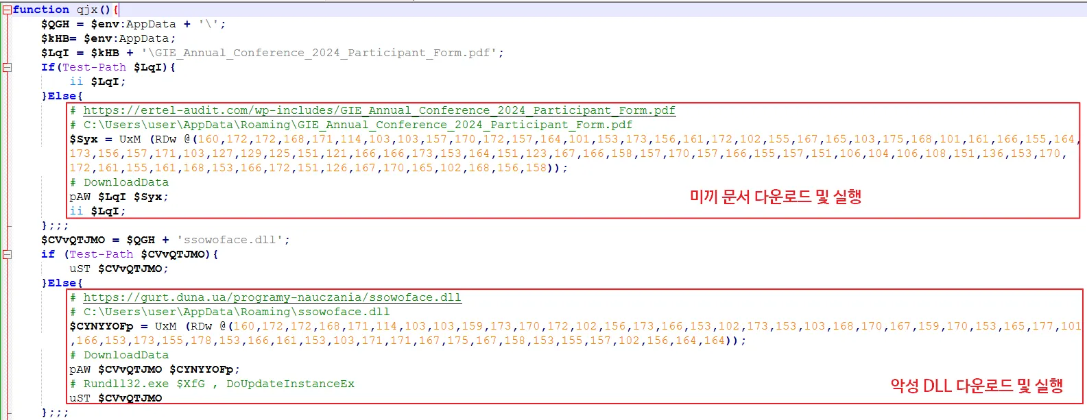 ○ 복호화된 파워쉘 명령어는 미끼 문서와 악성 DLL을 %APPDATA% 폴더에 다운로드하여 실행하는 코드로 확인
