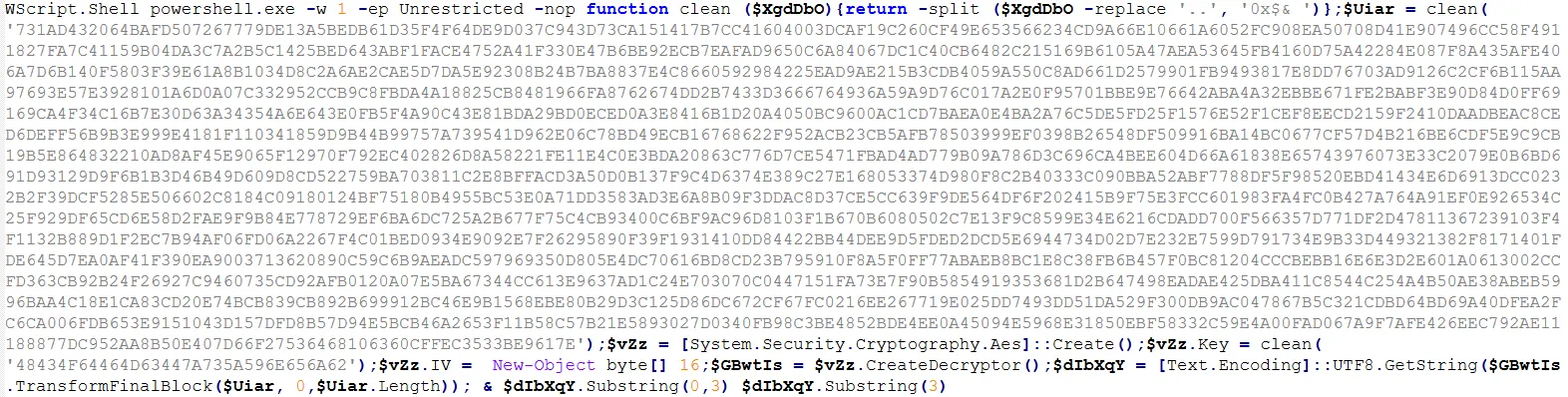 ○ 추출된 HTA 파일 데이터 내부에 이중 난독화된 JavaScript가 존재하여 난독화 해제 후 분석 결과 AES로 암호화된 파워쉘 명령어를 실행하는 코드 확인