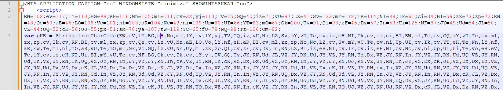 [그림 16] HTA 파일 내에 존재하는 난독화된 JavaScript 코드
