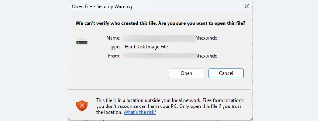 ○ 사용자가 큰 의심 없이 WebDEV 공유 파일을 자신의 시스템에 복사/붙여넣기하면 CVE-2024-38213에 의해 Mark-of-the-Web* 보호 기능이 적용되지 않아 파일 실행 시 [그림 6]과 같은 실행 경고가 발생하지 않음