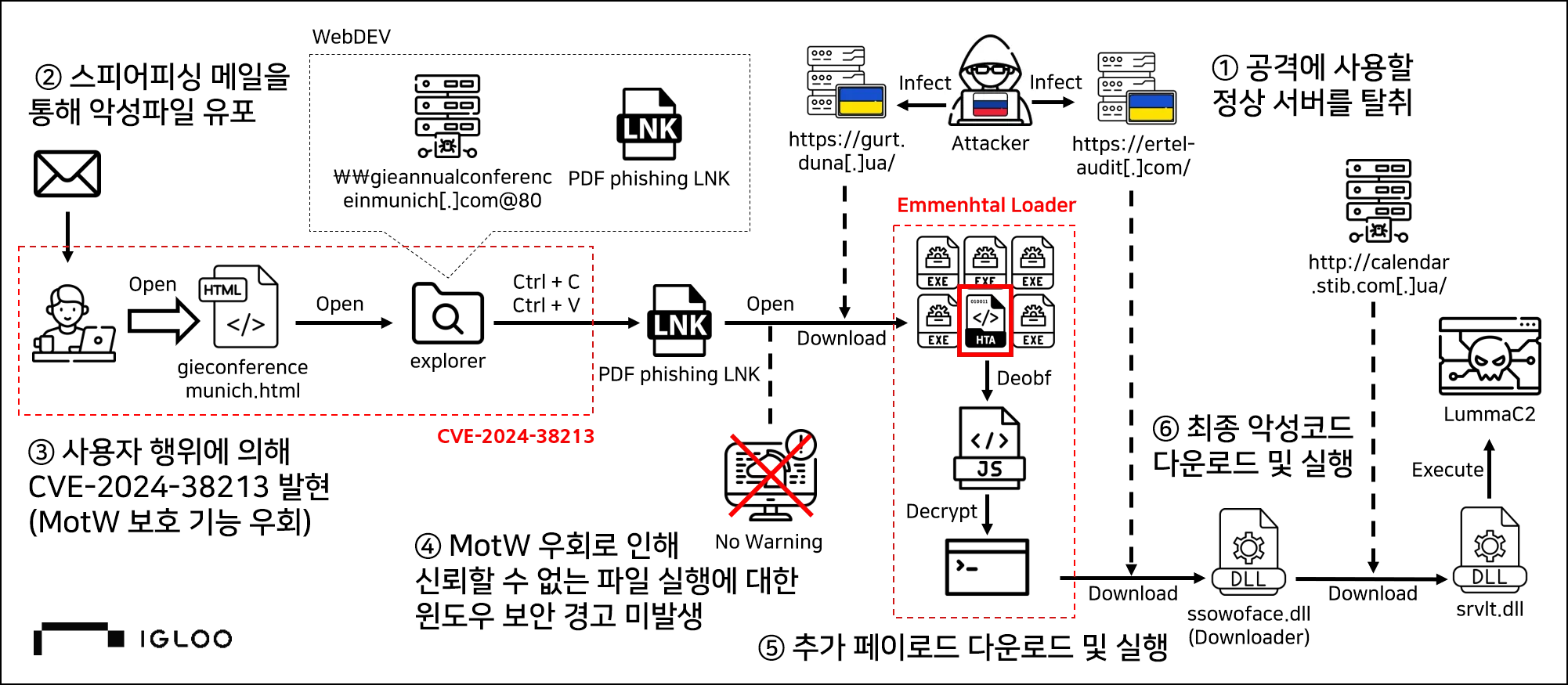 ○ 공격자는 악성 HTML 파일이 첨부된 스피어피싱 메일을 통해 사용자의 행위 유도하여 CVE-2024-38213 발현시켜 악성 LNK 파일을 보안 경고 없이 실행
