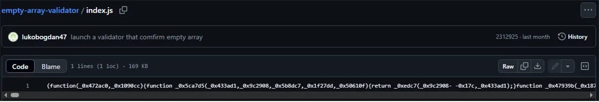 현재 활성화된 empty-array-validator 패키지가 사용하는 GitHub 저장소 접근 결과 난독화된 index.js에서 기존 BeaverTail 악성코드와 유포 방식과 동일한 방식을 사용하는 정황 확인