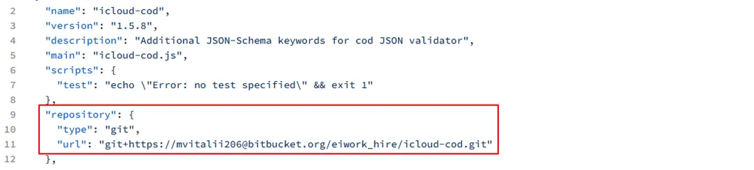 [그림 5] icloud-cod/package.json 내 Bitbucket 참조 코드