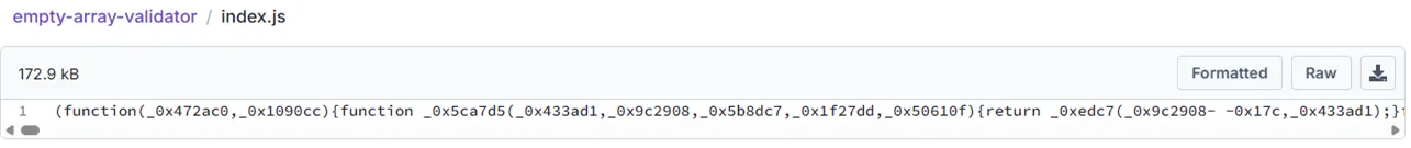 [그림 1] empty-array-validator/index.js 기준 난독화된 JavaScript 파일