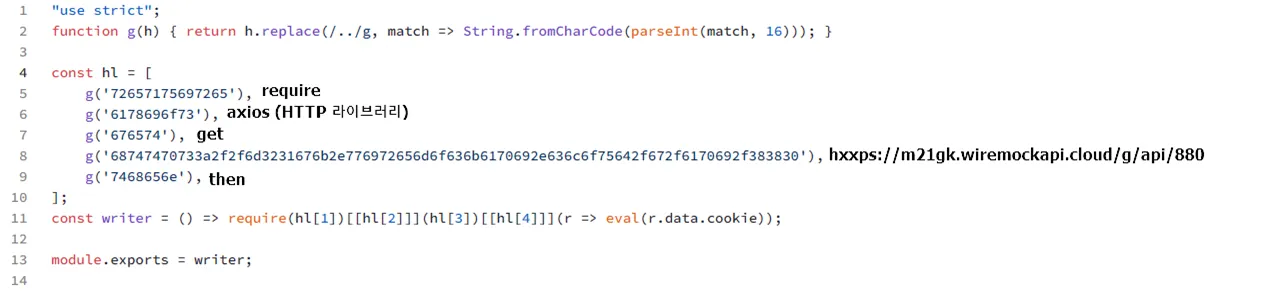 ○ [표 6]과 같이 악성코드에 필요한 문자열을 ASCII에서 16진수(HEX)로 변경한 후, HTTP라이브러리인 ‘axios’로 요청 데이터를 전송해 응답값에서 ‘data.cookie’내용을 eval()함수로 실행