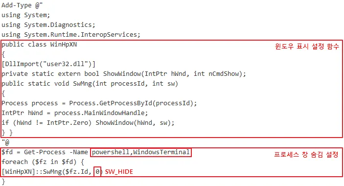 ○ $sd에 해당하는 스크립트의 경우 powershell, WindowsTerminal 프로세스를 찾아서 창을 숨기는 작업 수행