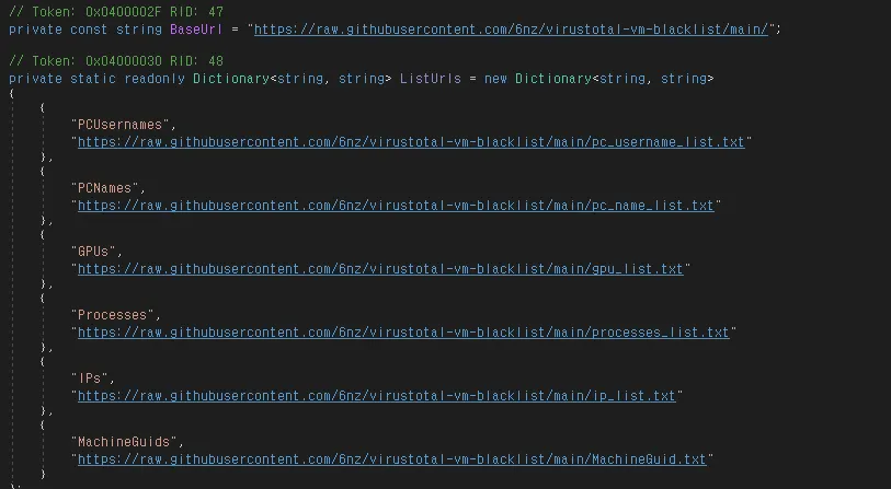 ○ 분석 방지를 위해 피해자 시스템의 사용자명, 컴퓨터명, GPU, CPU, 서비스, 프로세스, 가상환경 IP, MachineGUID 등을 확인하여 동작을 중지하는 기능이 있으며, 일부 항목의 경우 Github에 등재된 블랙리스트를 활용해 Virustotal 환경 또는 탐지용 환경임을 탐지