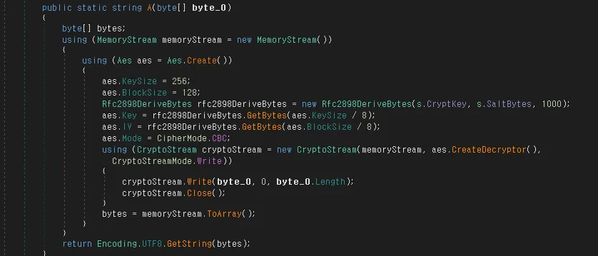 ○ Stealerium 악성코드의 설정 데이터는 별도의 CryptKey, SaltBytes를 이용해 KEY, IV를 생성하여 AES-CBC 방식으로 암호화된 상태