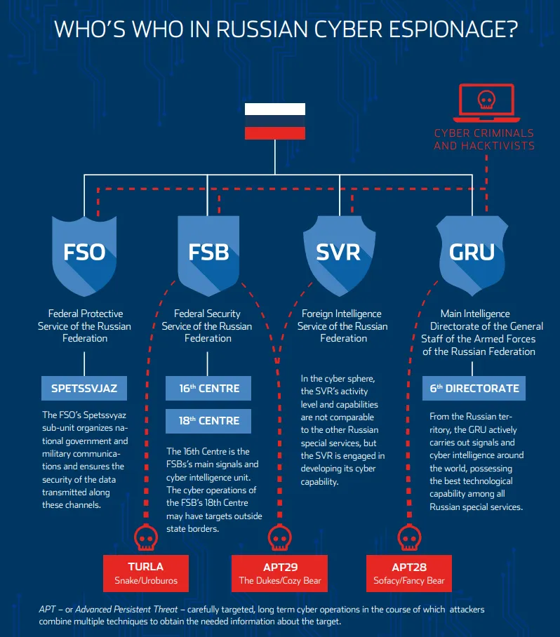 ○ 러시아는 경호총국(FSO)외에도 3대 정보기관인 연방보안국(FSB), 해외정보국(SVR), 총참모부 정보총국(GRU)을 통해서 사이버 공격을 수행