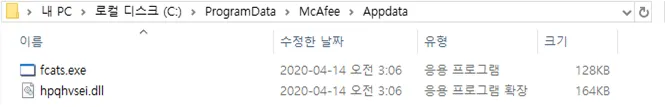 ○ 현재 파일의 실행경로를 확인해서 의도된 경로가 아닐 경우 exe, dll 파일을 의도된 경로(이번 샘플의 경우 ProgramData\McAfee\Appdata 폴더에 fcats.exe, hpqhvsei.dll 파일)로 복제