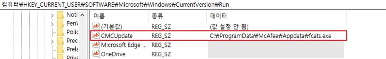 ○ 지속성 유지를 위해 서비스 이외에도 Run 레지스트리에 CMCUpdate 라는 이름의 값 생성