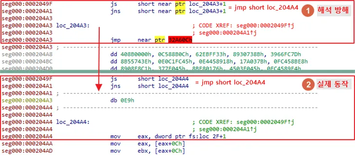 ○ 디스어셈블러의 해석을 방해하기 위해 서로 반대되는 분기 조건을 사용하는 방식 사용
