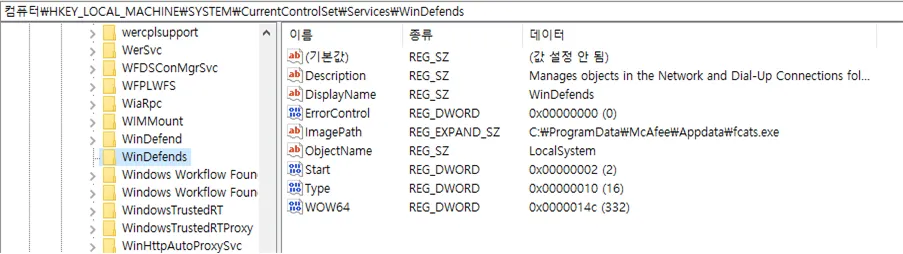○ 정상 서비스인 WinDefend와 유사한 WinDefends라는 명칭을 사용한 서비스 생성