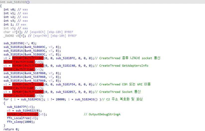 ○ 암호화된 C2 주소를 복호화하여 socket 생성한 후 통신 시도