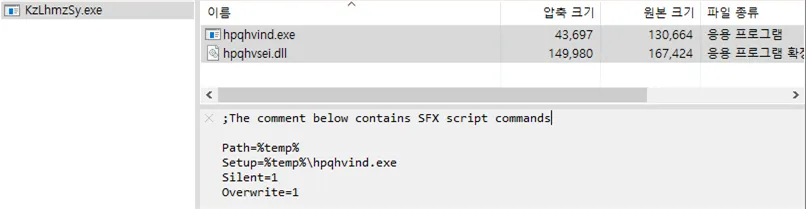 ○ 최초 확인되는 파일은 sfx 형식인 자체 압축 풀림 파일로, 실행 시 압축 해제 되면서 내장된 스크립트가 동작해 Temp 폴더에 exe, dll 파일 생성 및 exe 파일 실행