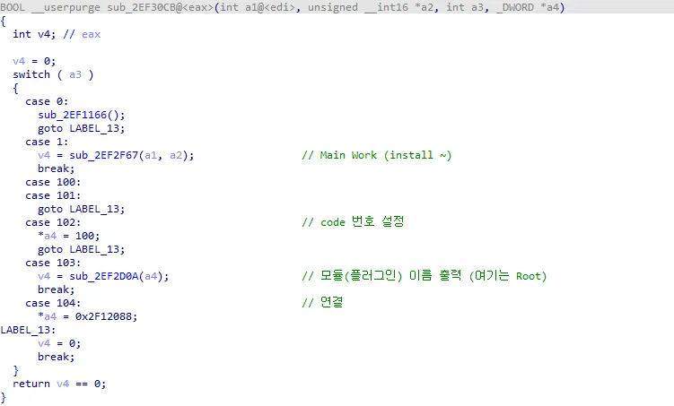 정적 분석 시 case 102, 103을 통해 모듈 파악 후 분석 진행하면 용이