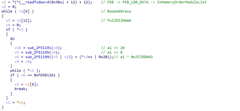 ○ API 사용 시 PEB를 이용해서 API 이름을 읽어온 뒤 자체 알고리즘으로 해시 값을 계산해 인자로 받은 값과 일치하는 API를 사용하는 동적 로드 방식