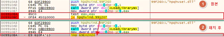 [그림 10] DllMain 동작(exe 파일 바이트 확인 및 패치)